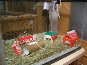 ケージをお掃除中は小さなプラケースの中で待機中のこまめち!